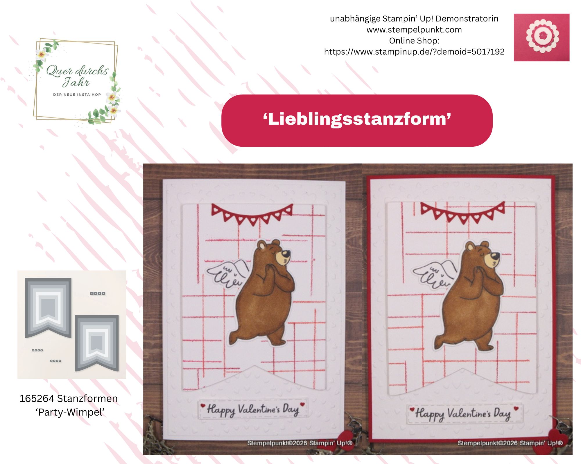 Heute gibt es den 49. VIDEO HOP von Stempelpunkt & Co. Einige Stampin‘ Up!-Demonstratorinnen haben sich zusammengetan, um euch an jedem 2. Samstag im Monat jeweils ein Video zu einem vorgegebenen Thema zu zeigen. Unser Thema im Februar ist ‚IDEEN ZUM VALENTINSTAG‘.