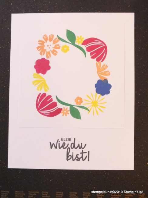 Mit dem Stempelset ‚Bloom by Bloom‘ aus dem Frühjahr-/Sommerkatalog kann man einen derartigen Blütenkranz zaubern.