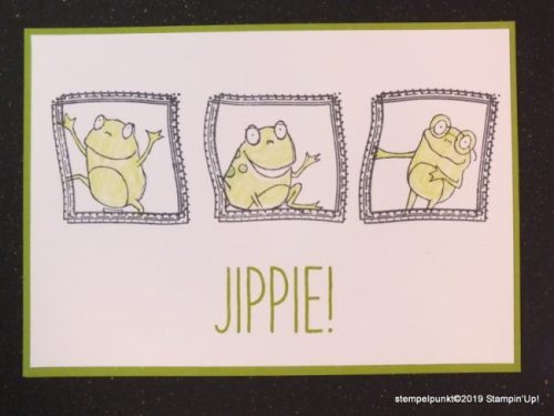 Diese lustigen Frösche gibt es als Stempelset (‚Froschkönig‘) während der Sale-a-Bration gratis. Die Rahmen gibt es im Jahreskatalog (‚Swirly Frames‘).