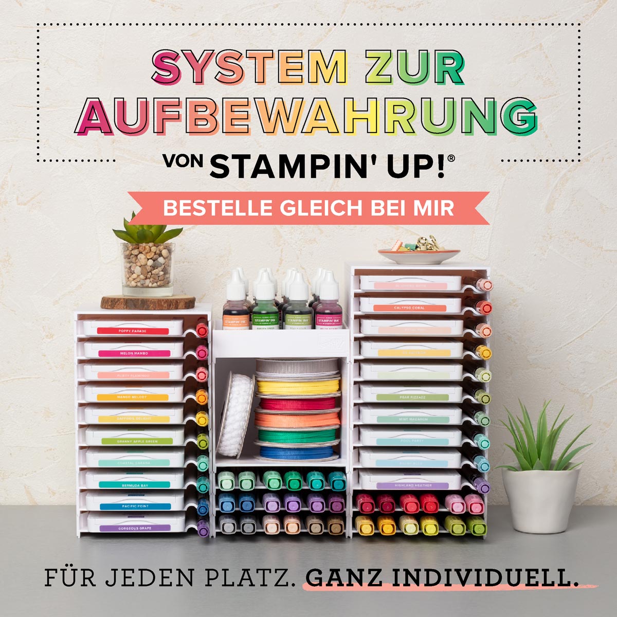 Stampin‘ Up! hat ein ganz tolles Aufbewahrungssystem für Stempelkissen, Farbstifte, Nachfüller ua entwickelt. Stempelkissen und Farbstifte werden optimal liegend gelagert. Das System ist neutral in Weiß gehalten. So bringt ihr endlich Ordnung an euren kreativen Arbeitsplatz. Dieses System ist ab dem 1. April erhältlich.
