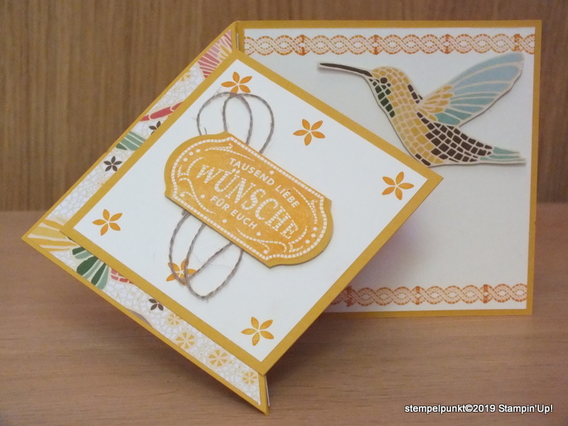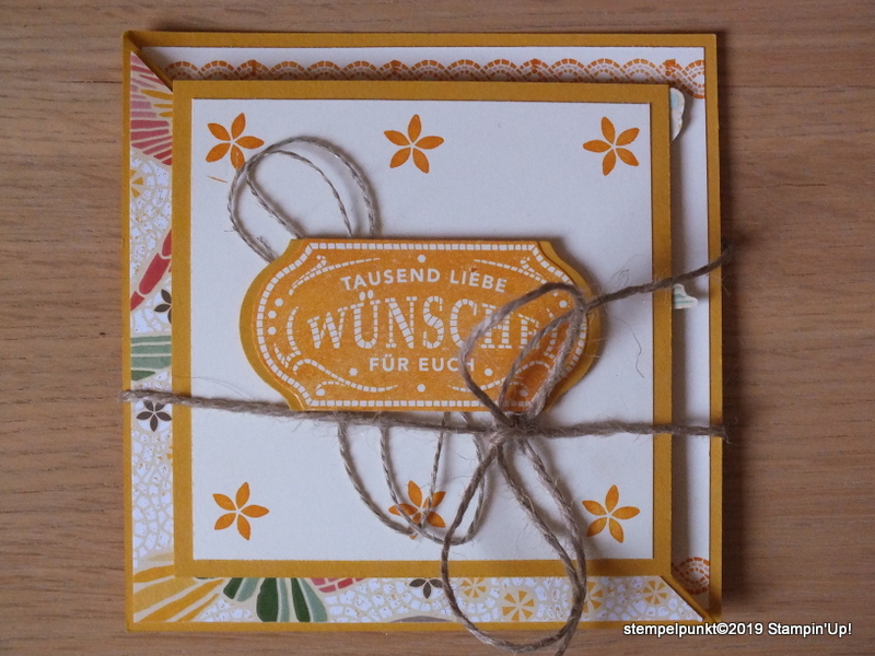 Am ersten und dritten Sonntag eines Monats gibt es einen Beitrag des Stempelzeit Teams mit einer Anleitung, die individuell von allen teilnehmenden Demonstratorinnen umgesetzt wird. Die heutige Anleitung kommt von Danja Steigl-Braun .Wir Demonstratorinnen dürfen ja schon mit den Produkten aus dem neuen Jahreskatalog spielen. Bei mir kam die Produktreihe ‚Märchenhaftes Mosaik‘ zum Einsatz (Seite 120). Die einzelnen Produkte liste ich unten auf.