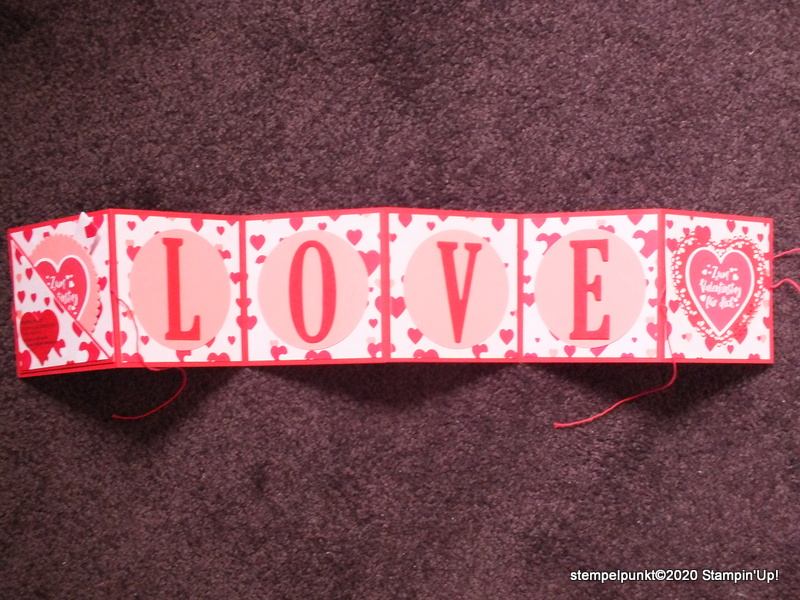 Dekorieren nach Belieben. Ich habe Produkte aus der Reihe ‚Von Herzen‘ aus dem Frühjahr-/ Sommerkatalog von Stampin‘ Up! verwendet. Die Stanzformen ‚Grosse Buchstaben‘ sind leider nicht mehr im Programm. Ein guter Ersatz wären die Stanzformen ‚Handgeschrieben‘ (149550).