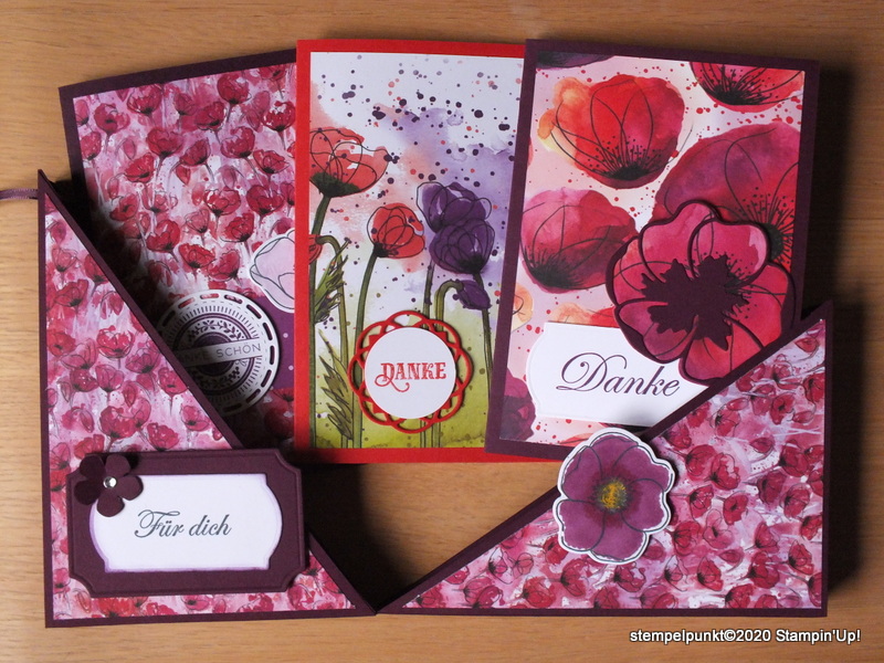 Zum Verschönern der Box habe ich das wunderschöne Designerpapier ‚Mohnblütenzauber‘ verwendet. Auch das Stempelset ‚Painted Poppies‘ und die darauf abgestimmten Stanzformen (Fj/S-Katalog) kamen zum Einsatz.