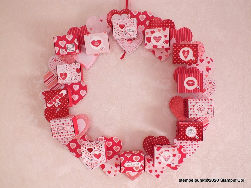 In drei Tagen ist Valentinstag. Da kommt ein Kalender für ’14 Tage bis Vantinstag‘ natürlich ein wenig spät. Aber als Deko ist er superschön. Das wunderschöne Designerpapier und die Herzstanzen sind perfekt für dieses Projekt. Man benötigt ca. 30 Herzen.