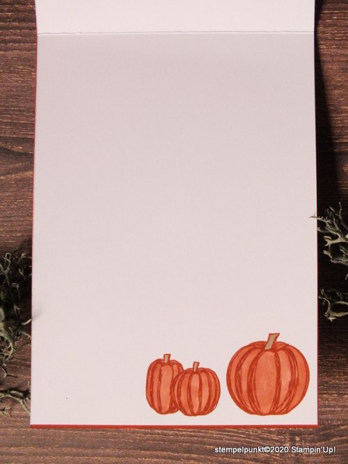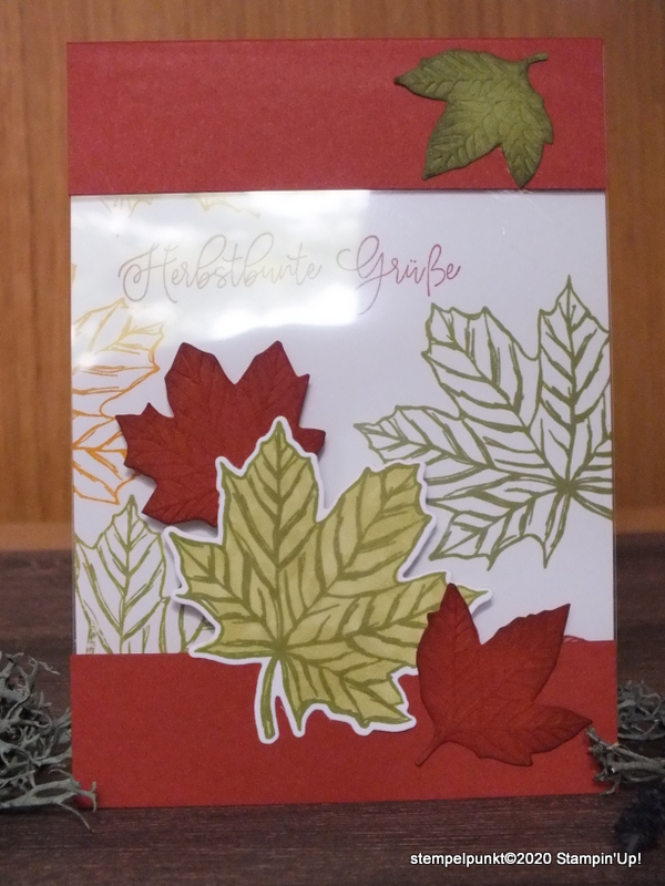 Es wird herbstlich. Zum Glück wurde das Stempelset ‚Gather together‘ mit den passenden Stanzformen übernommen. Ein herbstliches Highlight! Die Karte ist in ‚Terrakotta‘ und ‚Olivgrün‘ gehalten.