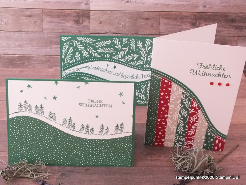 Ich habe schon mal mit dem Vielfaltspaket ‚Schön schwungvoll‘ gespielt. Dabei sind diese Weihnachtskarten entstanden. Die Stanzformen und Stempel sind super – nicht nur für Weihnachten. Es gibt ein Stempelset speziell für Weihnachten und eines für das ganze Jahr. Das Produktpaket enthält auch das oben gezeigte Designerpapier in tollen Weihnachtsfarben.