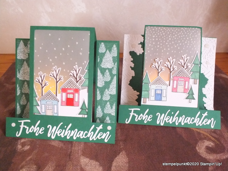 Ich zeige euch eine beleuchtete Aufstellkarte (LED-Licht) mit einem verschneiten Winterdorf . Das gibt stimmungsvolle Adventsbeleuchtung.