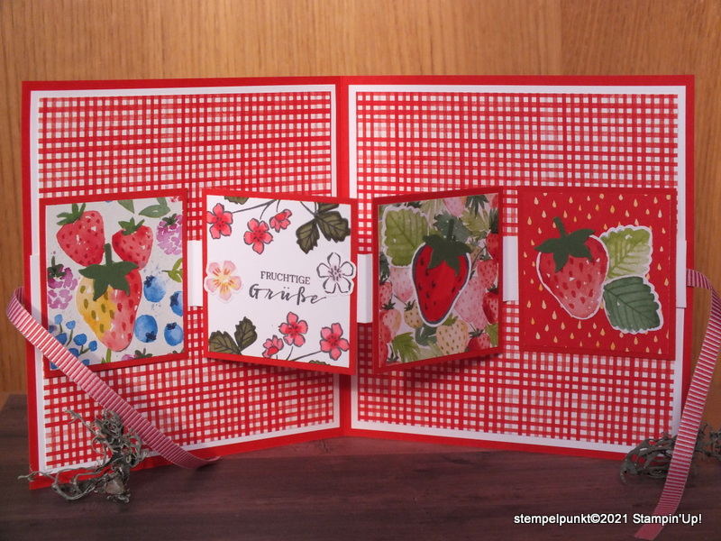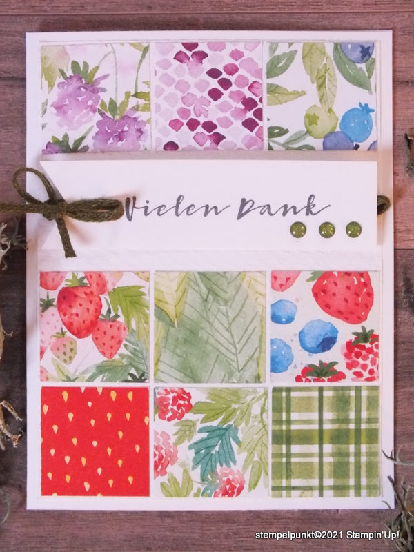 Während der Sale-a-Bration (5.1. bis 28.2.2021) stelle ich euch jeden Freitag ein Gratisprodukt vor, diesmal das Produktpaket ‚Fruchtige Grüße‘, bestehend aus dem Stempelset ‚Fruchtige Grüße‘ und dem Designerpapier ‚Sommerbeeren‘. Dieses Gratisprodukt gibt es ab einem Einkaufswert von 120€ *. Das lohnt sich wirklich. Nach der Sale-a-Bration sind die Gratisprodukte i.d.R. nicht mehr erhältlich. Nur selten werden die Produkte übernommen. Und es sind wirklich schöne Stempelsets und Designerpapiere dabei.