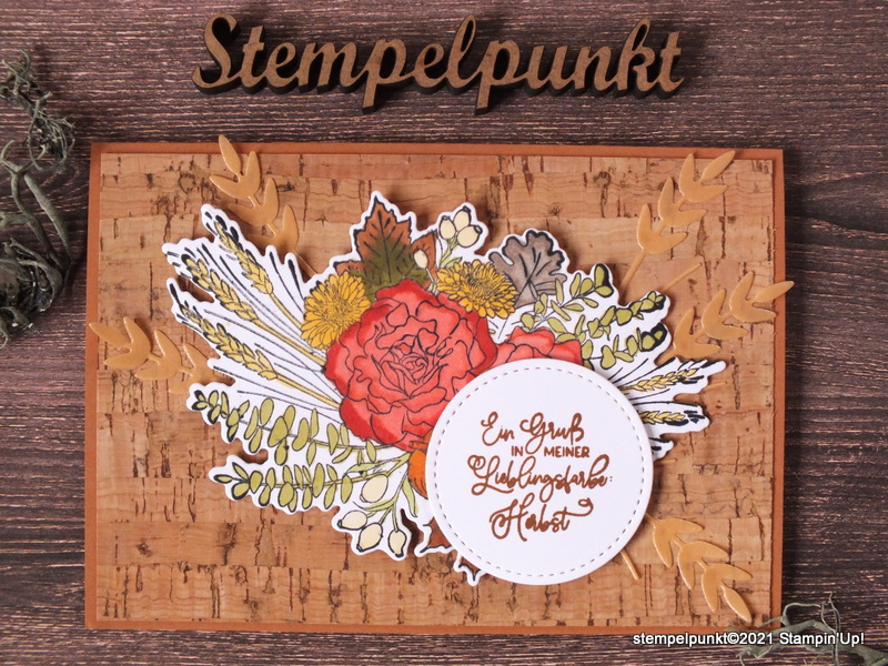 Das bei dieser Karte verwendete Stempelset ‚Herbstbunte Grüße‘ mit den passenden Stanzformen ist leider nicht mehr im Programm. Aber schaut mal in meinen Flohmarkt. Neu ist das Spezialpapier ‚Kork‘ aus dem aktuellen Minikatalog. Das fasst sich schon so toll an. Es ergibt sich aber auch ein wunderschöner Effekt. Tipp: man könnte damit einen Einband für ein Büchlein/ Fotoalbum machen.