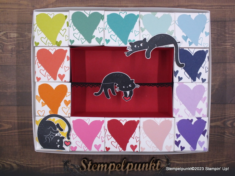 Diesen VALENTINSKALENDER musste ich einfach nachbasteln. Gesehen habe ich ihn bei Steffi’s Kartenhaus. Meinen Mann hat zwar nur der Inhalt interessiert. Und er meinte, das Ganze sollte ein Theater darstellen. Aber ich finder ihn wunderschön. Wie Steffi habe ich das Produktpaket ‚Rustikaler Strauss‘ und die süßen Katzen aus dem Stempelset ‚Love Cats‘ von Stampin‘ Up! verwendet.
