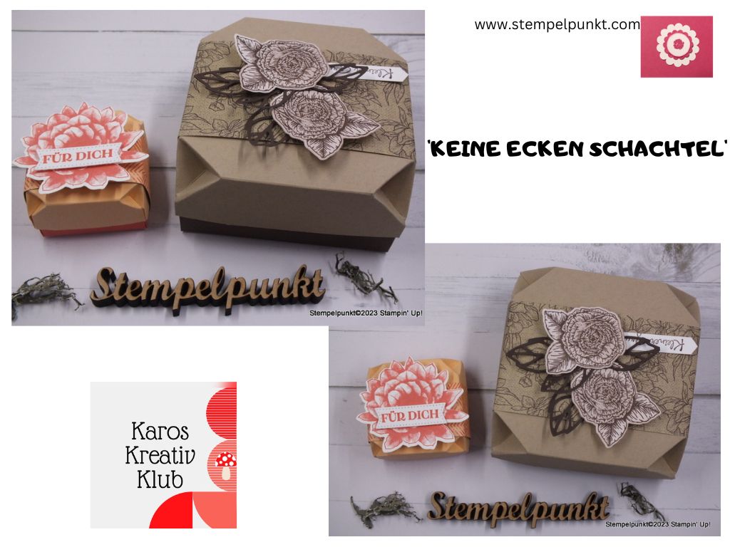 Gestern wurde wieder in Karos Kreativ Klub gebastelt. Dabei sind diese ‚KEINE ECKEN SCHACHTELN‚ – in großer und in kleiner Form – entstanden ( z. B. für quadratische Schoklade in großer und in kleiner Größe). Ich habe das Designerpapier ‚Vintage Rosen‘ und‚Zauber der Wüste‘ von Stampin‘ Up! verwendet (Auslaufprodukte**). Eine originelle Verpackung als Mitbringsel für gute Freunde.