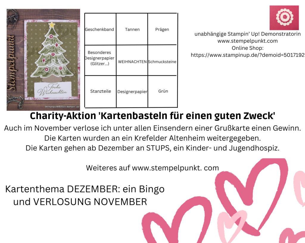 Die Aktion wird also weiterlaufen, jedoch ohne Gewinne. Es gab so viele positive Kommentare, dass ich mich entschlossen habe weiterzumachen. Mache auch im Dezember mit, damit viele Karten für das STUPS in Krefeld zusammenkommen. Das neue Thema wird im Video vorgestellt: ‚ein Bingo‘. Ich freue mich auf eure Karten.