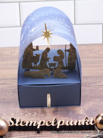 Heute zeige ich eine ‚SCHWIBBOGEN BOX‘ nach einer Idee von Stempel & Co. Verwendet habe ich die Produktreihe ‚Heilige Nacht‘. Das war ein Topseller. Hoffentlich hast du rechtzeitig bestellt. Eigentlich wollte ich Farbkarton in ‚Marineblau‘ nehmen. Den hatte ich aber gerade restlos verbraucht. ‚Abendblau‘ passt auch gut zum Designerpapier. Das Papier in ‚Antikgold‘ finde ich superschön.