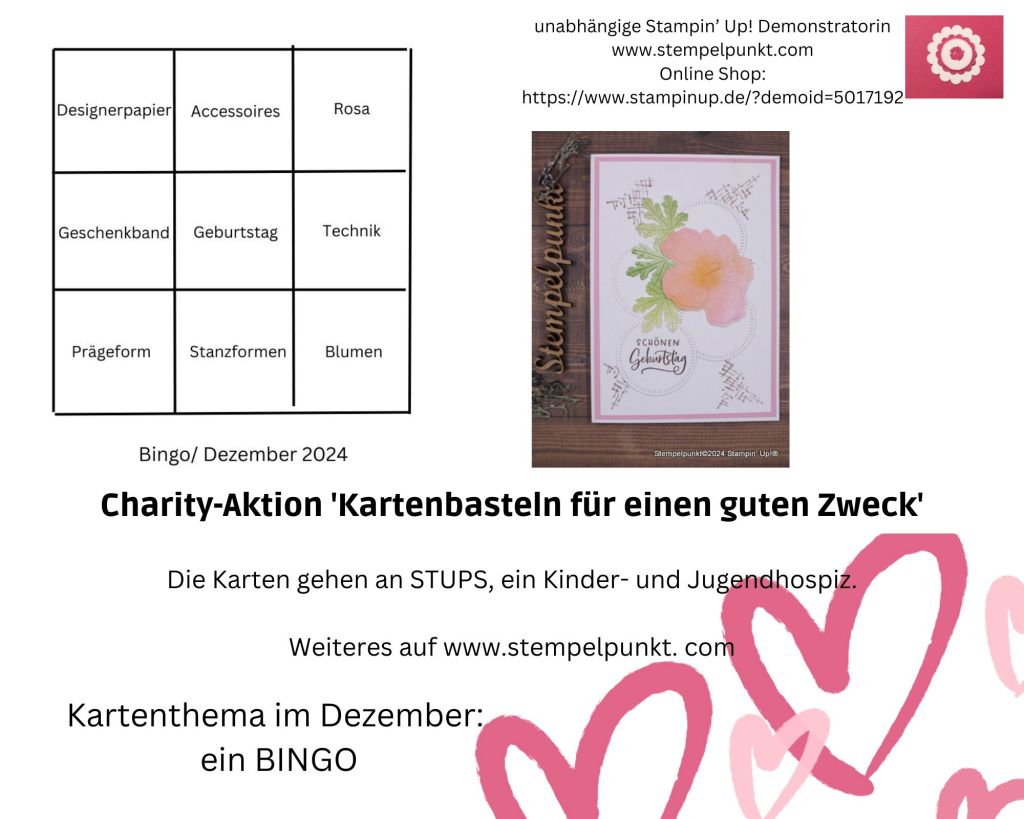 Im Video zur Charity-Aktion zeige ich eure gespendeten Karten vom November. Und es gibt eine neue Vorgabe für den Dezember – wieder ein Bingo, weil das so beliebt ist. Ich freue mich auf eure Karten. Anfang Januar gibt es ein neues Video dazu.