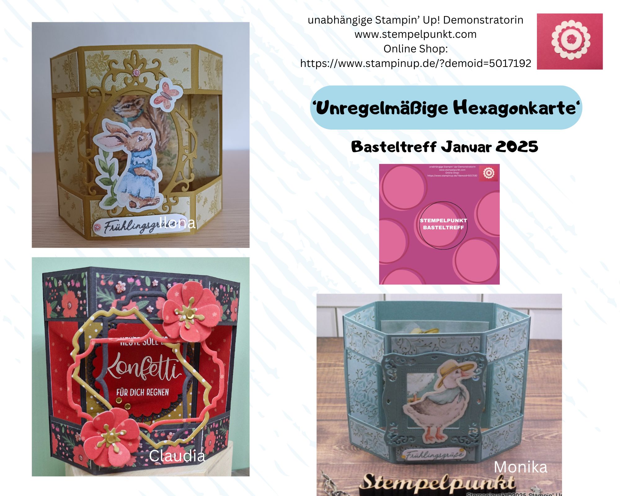 Im Januar gab es wieder einen ‚Basteltreff‘ per Zoom. Es ist immer eine nette Runde zum Basteln und Quatschen. Diesmal haben wir eine ‚Unregelmäßige Hexagonkarte‚ gewerkelt. Wenn du auch teilnehmen möchtest, melde dich bei mir. Die Termine stehen rechts auf meinem Blog. Der nächste Termin ist am 11. Februar, ab 19.00 Uhr. Den Zugangslink gibt es immer nach der Anmeldung.