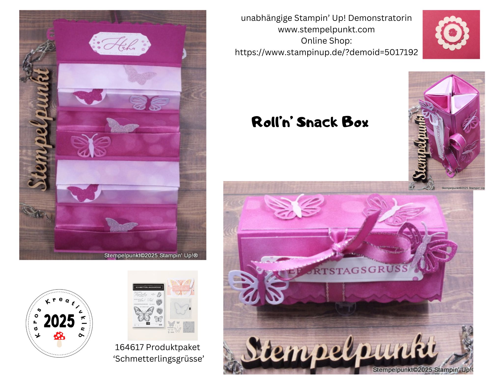 Am letzten Freitag gab es wieder ein virtuelles Treffen in @karoskreativklub. Wir haben eine ‚ROLL’N‘ SNACK BOX‘ gebastelt. Ich habe das schöne Besondere Designerpapier ‚Schmetterlingszart‘ und das Produktpaket ‚Schmetterlingsgrüsse‘ (164617) von Stampin‘ Up! verwendet. Wenn du z.B. dieses Produktpaket bestellst, erhältst du einen Gratisartikel im Rahmen der Sale-a-Bration- nur noch bis 28. Februar!