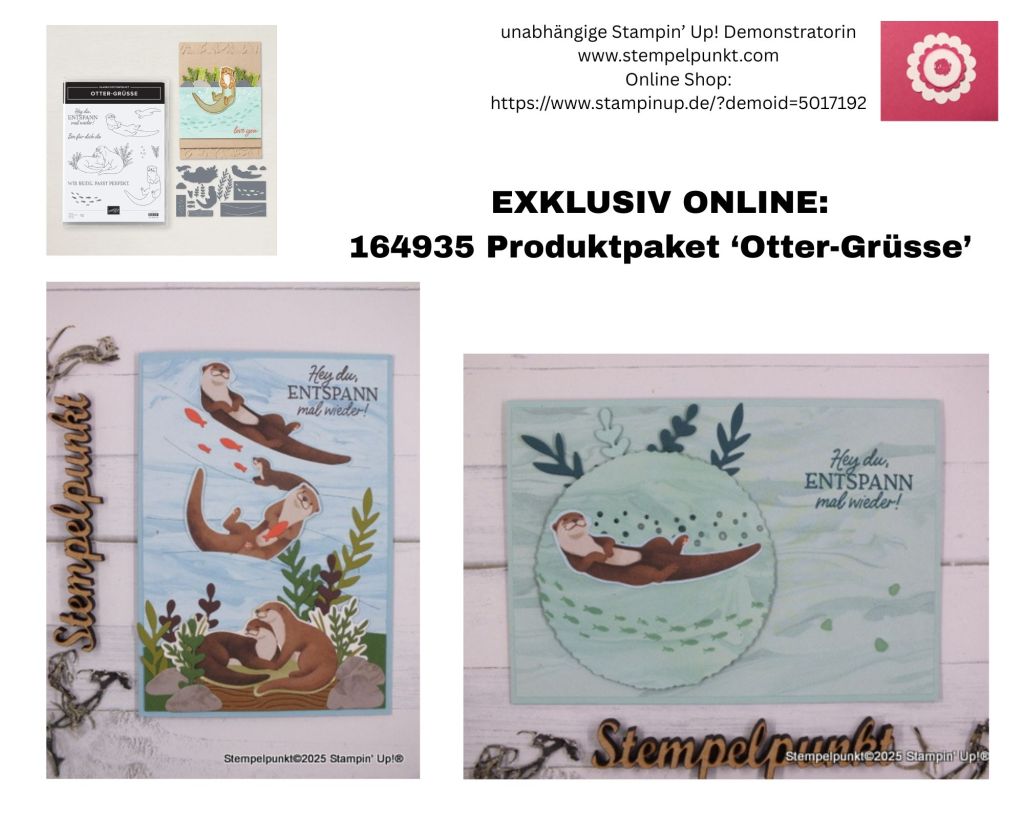 Heute gibt es Teil 2 der You Tube-Reihe zu den Exklusiv Online-Produkten von Stampin‘ Up! An 5 Tagen gibt es 5 Videos, in denen jeweils ein Produktpaket vorgestellt wird- mit jeweils zwei Beispielprojekten. Diesmal geht es um das Produktpaket ‚Otter-Grüsse‘.