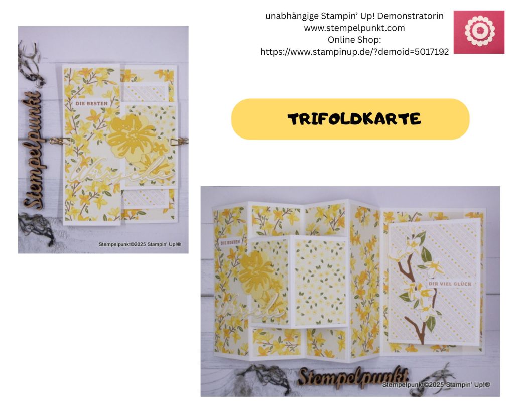 In meinem You Tube-Video vom 26. März habe ich erklärt, wie diese TRIFOLDKARTE gebastelt wird. Heute zeige ich eine weitere, frühlingshafte Version. Gearbeitet habe ich u.a. mit dem wunderschönen Designerpapier ‚Blumen nach Wunsch‘ von Stampin‘ Up! Die Karte ist schnell gemacht. Das ist immer sinnvoll, wenn man viele Karten braucht.