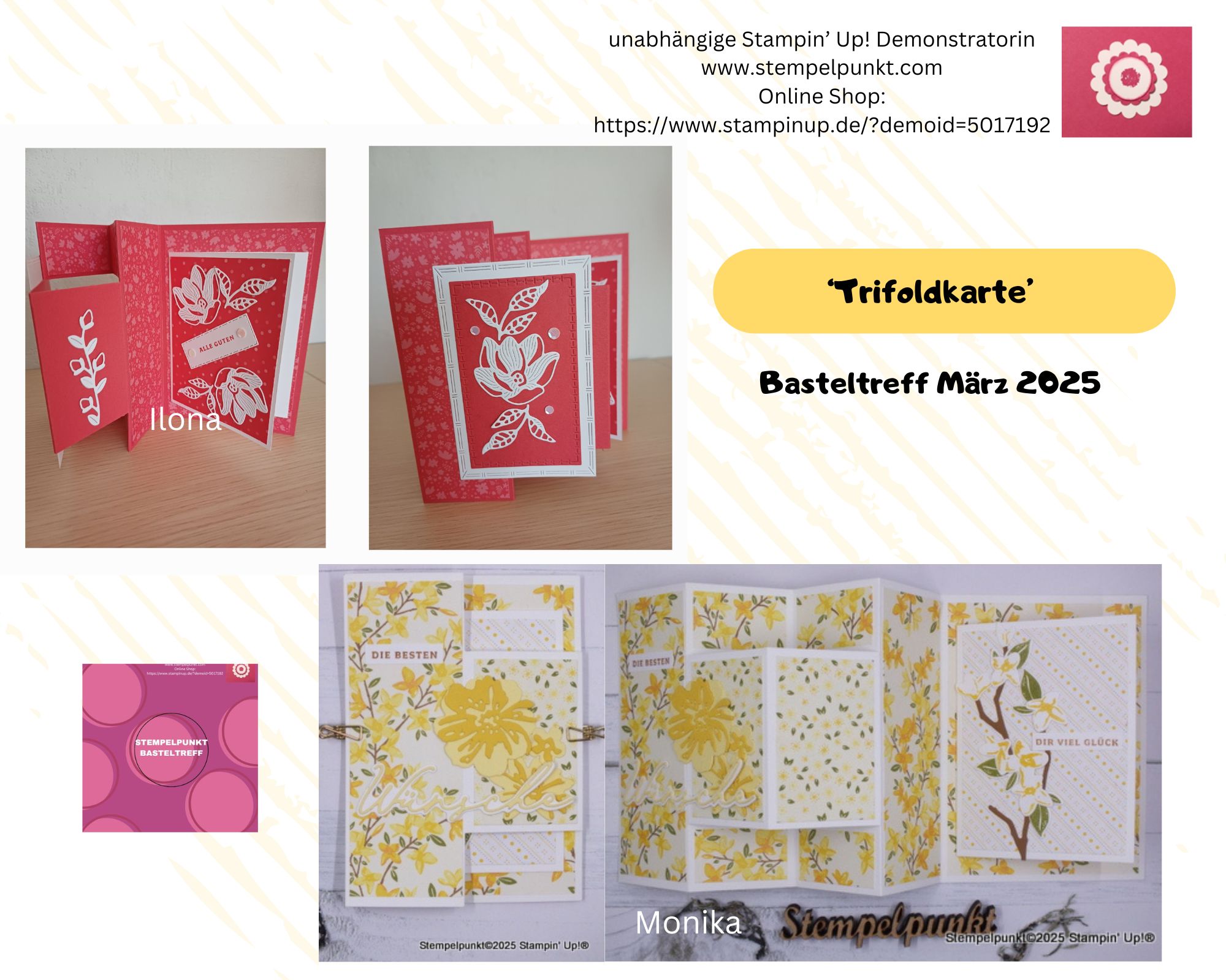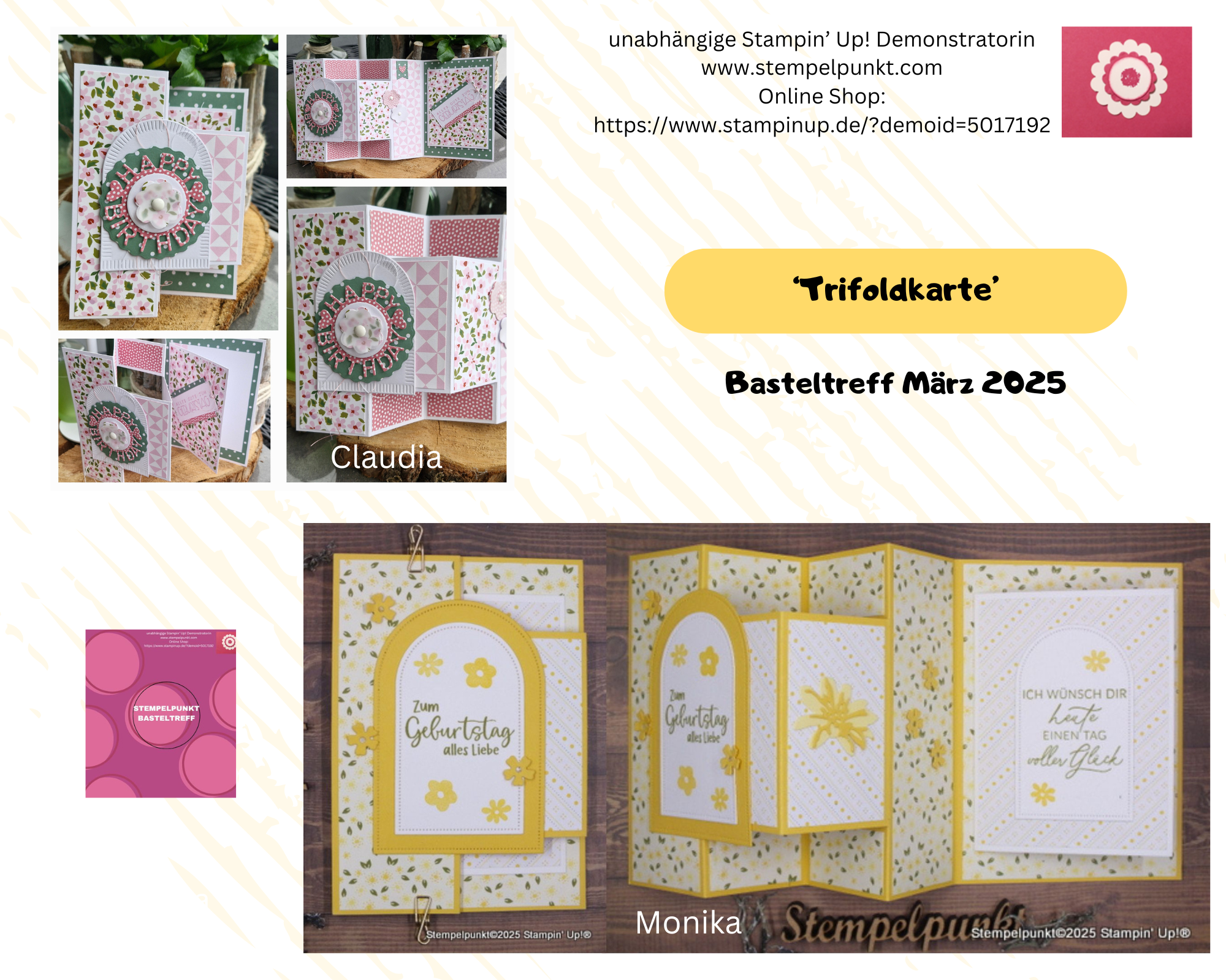 Auch im März gab es wieder einen ‚Basteltreff‘ per Zoom. Es ist immer eine nette Runde zum Basteln und Quatschen. Diesmal haben wir eine TRIFOLDKARTE gewerkelt. Die Grundform war schnell gemacht. Die Deko brauchte dann etwas Zeit.