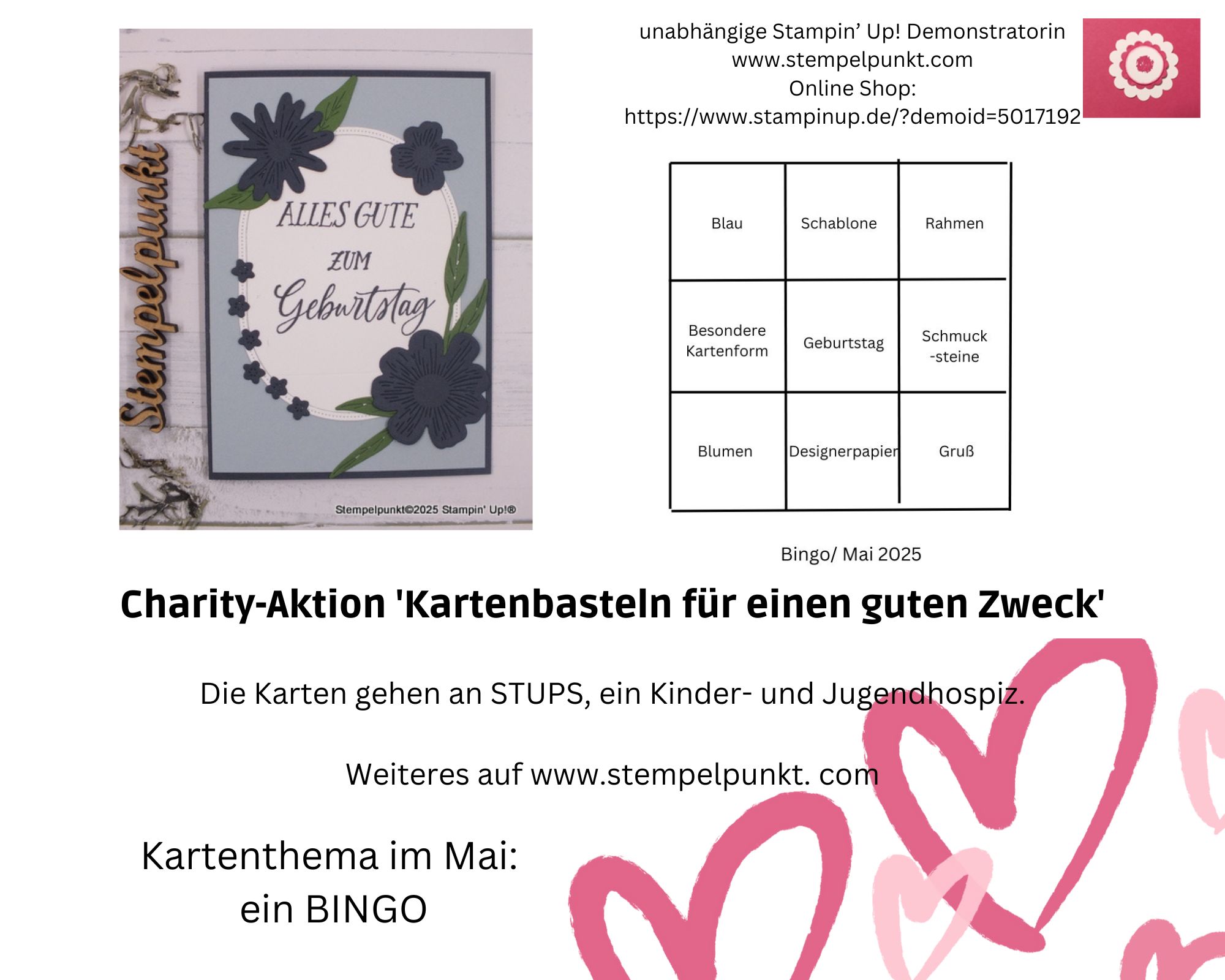 Im Video zur Charity-Aktion zeige ich eure gespendeten Karten vom April. Und es gibt eine neue Vorgabe für den Mai – wieder ein Bingo, weil das so beliebt ist. Ich freue mich auf eure Karten. Anfang Juni gibt es ein neues Video dazu.