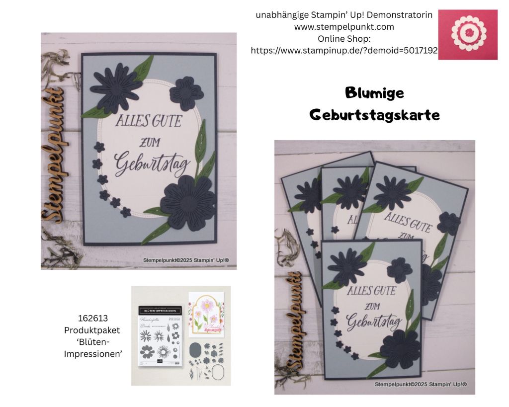 Diese Karte hast du schon in meinem Video zur aktuellen Charity-Aktion gesehen. Das Produktpaket ‚Blüten- Impressionen‘ von Stampin‘ Up! gehört z.Zt. zu meinen Favoriten. Das Oval mit dem Stickrand und die strukturierten Blumen sind wunderschön und ganz fix ausgestanzt. Mini-Blümchen kann man immer gebrauchen. Es kamen neue In Colors zum Einsatz: ‚Tiefseeblau‘ und ‚Wolkenmeer‘.