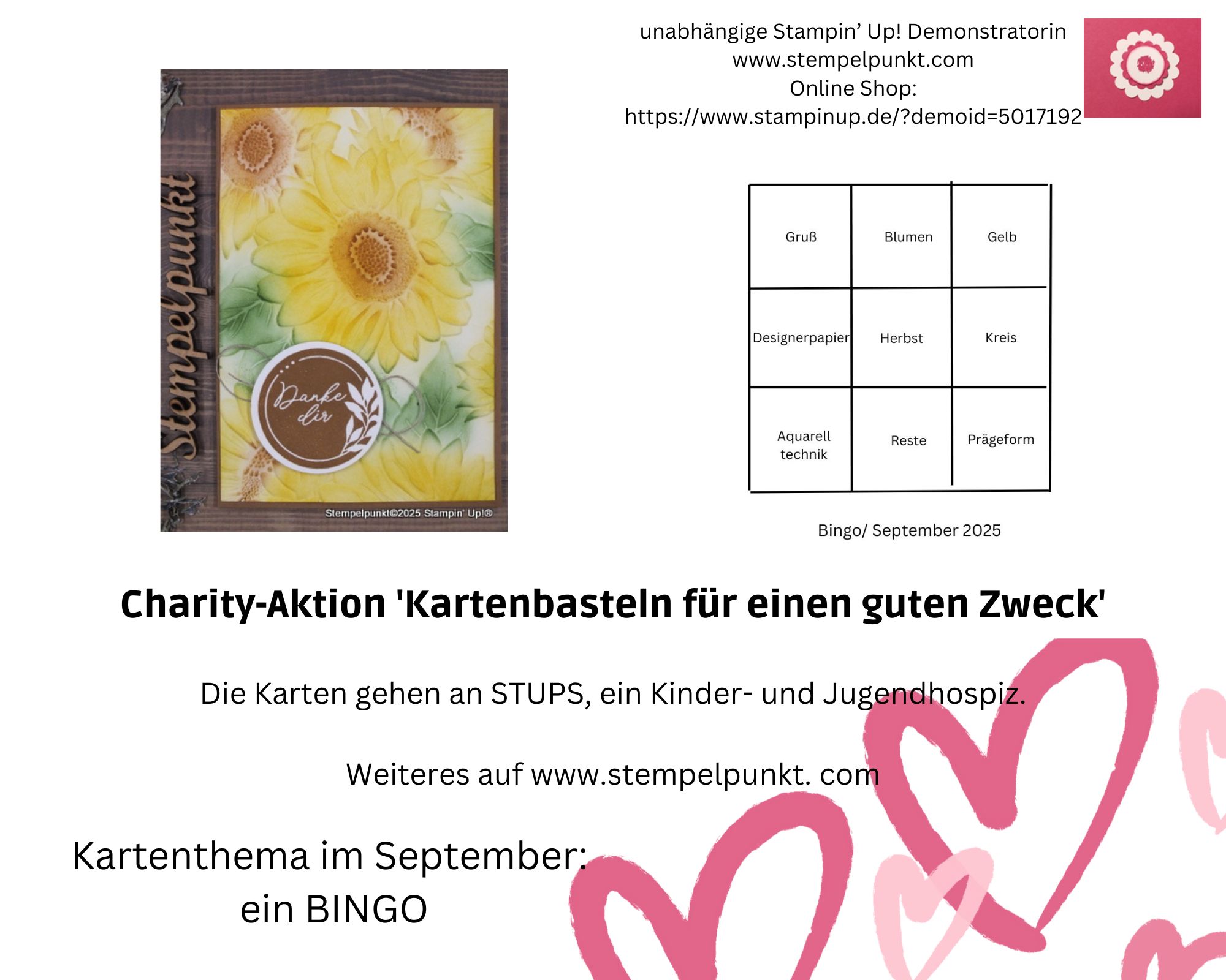 Im Video zur Charity-Aktion zeige ich eure gespendeten Karten vom August. Und es gibt eine neue Vorgabe für den September – wieder ein Bingo, weil das so beliebt ist. Ich freue mich auf eure Karten. Anfang Oktober gibt es ein neues Video dazu.