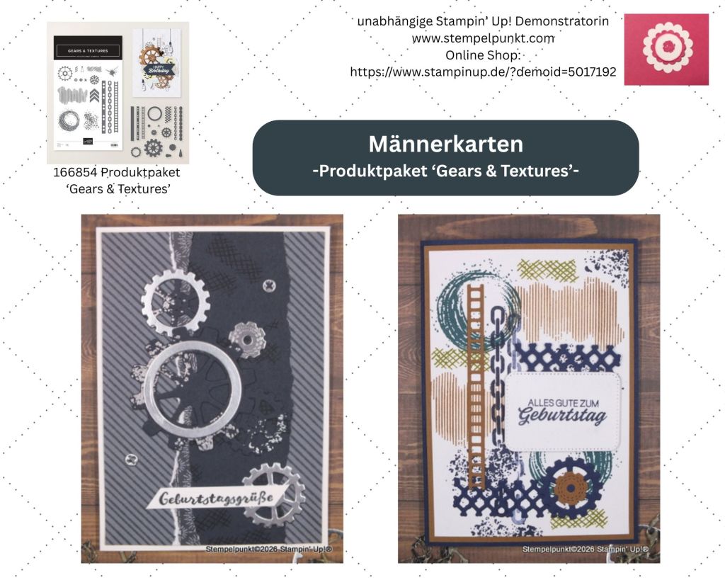 Für diese Männerkarten habe ich wieder das Produktpaket ‚Gears & Textures‘ verwendet -mein absoluter Favorit aus dem neuen Minikatalog. Leider ist das Produktpaket derzeit nicht bestellbar, ich rechne Anfang Februar damit. Du kannst im Online-Shop eine Verfügbarkeitsbenachrichtigung aktivieren.