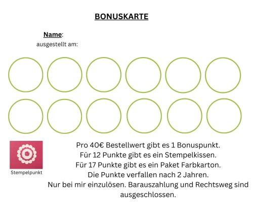 Du hast sicherlich Gutscheine während der ‚Bonustage‘ gesammelt. Im Zeitraum 3.-28. Februar können diese bei einer Bestellung eingesetzt werden – in meinem Online-Shop oder direkt bei mir. In den nächsten Tagen biete ich einen Gruppenversand an. Dabei kannst du auch noch Portokosten sparen. Wenn du mehrere Codes einlöst, füge zwischen jeden Code ein Leerzeichen ein. Jeder Gutschein-Codes darf nur ein Mal eingelöst werden.. Nach dem 28. Februar können keine Codes mehr eingelöst werden.