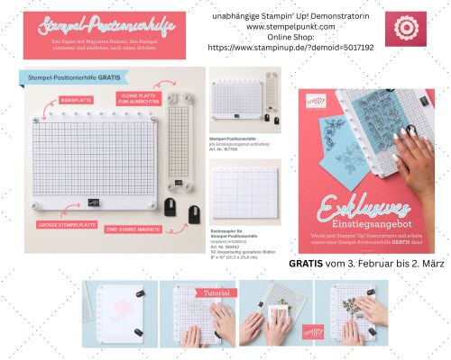Es gibt ein exklusives Einstiegsangebot für neue Demos: die neue Stempel- und Positionierhilfe. Dieses Arbeitsmittel hilft beim Ausrichten, erleichtert das Stempeln und sorgt für akkurate Ergebnisse. Damit gelingen präzise positionierte Motive, sich wiederholende Muster sowie Two-Step-Stempeltechniken ganz einfach – und du gestaltest mehrere Exemplare desselben Projekts in Minutenschnelle! Zusätzlich gibt es das normale Einstiegsangebot: du suchst dir Produkte im Wert von 175€ aus und bezahlst nur 129€. Weiteres -> hier