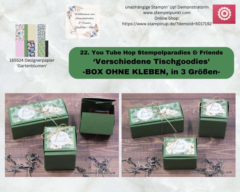 Im Rahmen des 22.You Tube Hop Stempelparadies & Friends mit dem Thema ‚VERSCHIEDENE TISCHGOODIES‘ zeige ich eine BOX OHNE KLEBEN in drei Größen. Die Box ist ganz schnell gemacht und kann an den Inhalt angepasst werden.