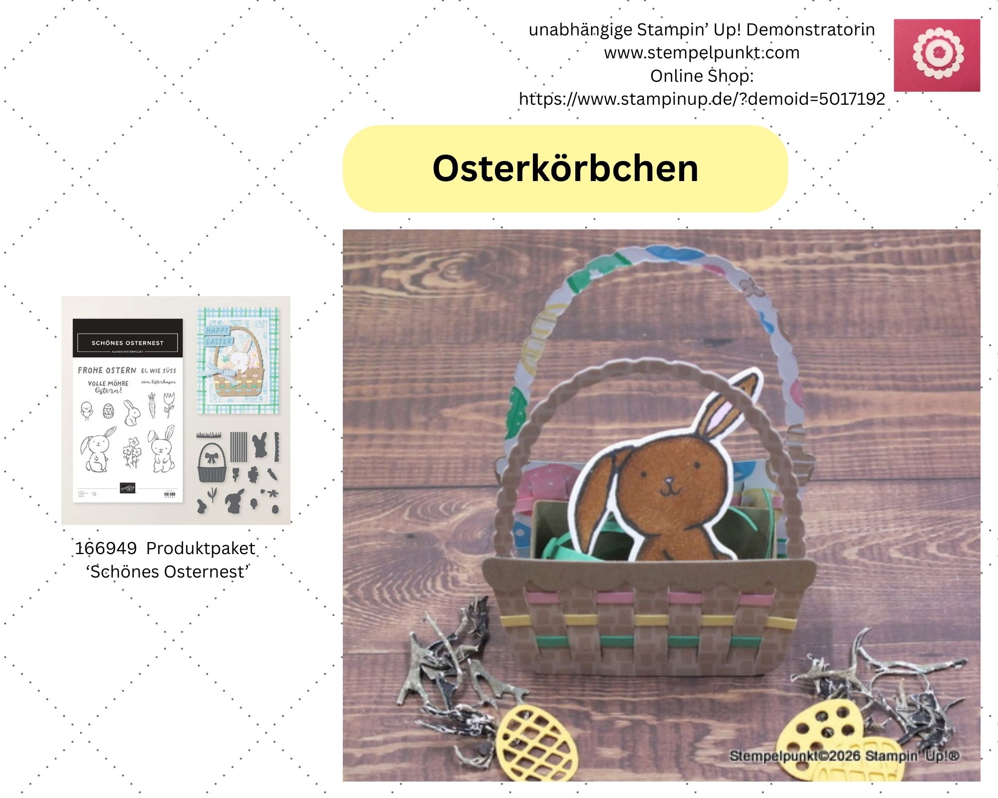 So langsam geht es auf Ostern zu. Deshalb zeige ich heute mein zweites Osterkörbchen. Das kann man ganz leicht mit den Stanzformen ‚Schönes Osternest‘ basteln. Der Clou ist dabei die Stanzform für die Flechttechnik.