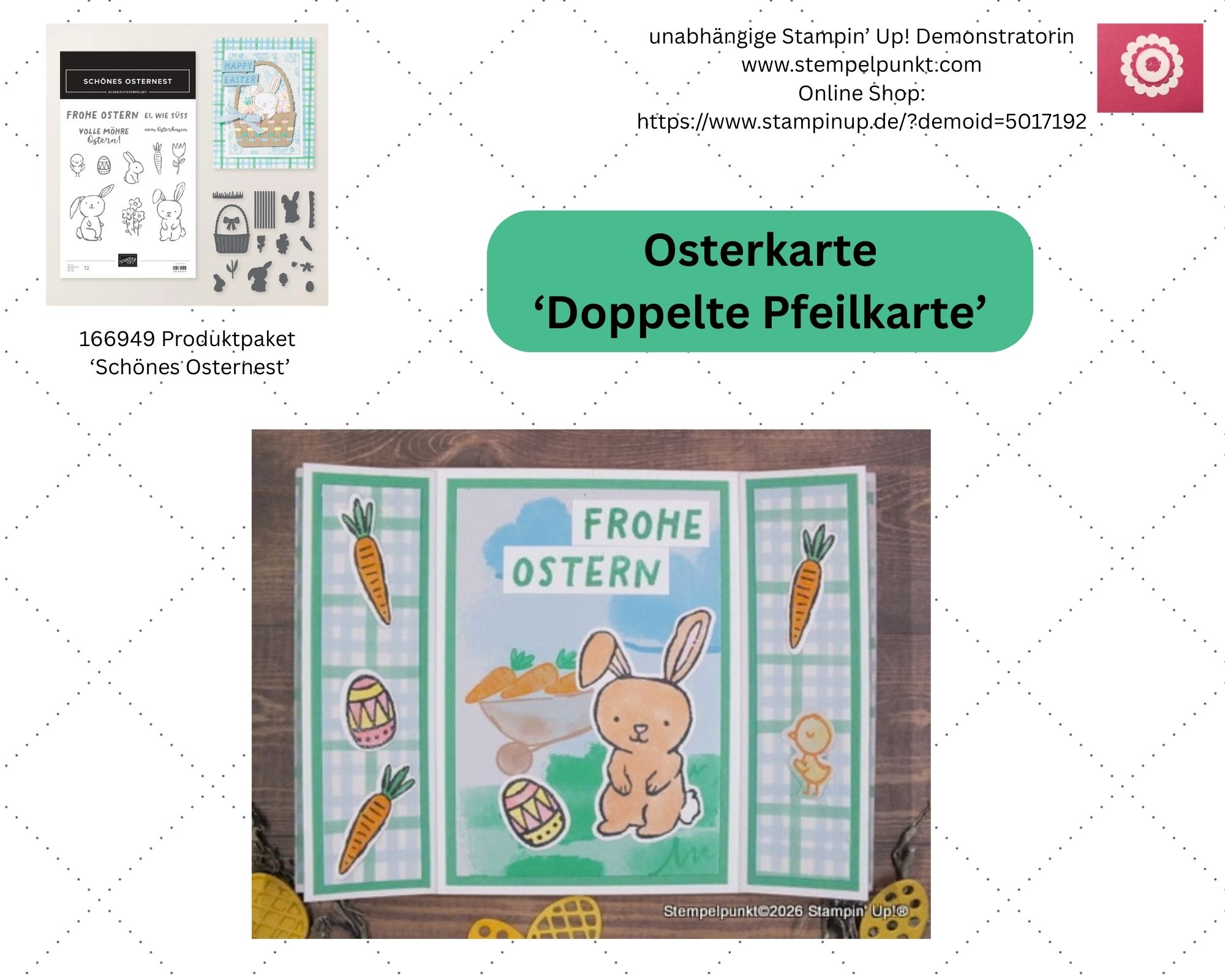 Bei meinem letzten ‚Basteltreff‘ wurde diese DOPPELTE PFEILKARTE gebastelt. Ich habe wieder mit meinem derzeitigen Lieblings-Produktpaket ‚Schönes Osternest‘ von Stampin‘ Up! gearbeitet. Und ich habe die In Colors 2024-2026, die uns leider im Mai verlassen, verwendet. Wenn du diese Farben auch so magst wie ich, dann decke dich noch rechtzeitig ein.