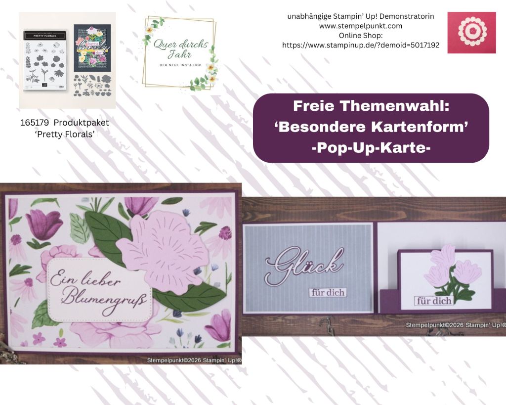 Beim Insta Hop Quer durchs Jahr gibt es heute freie Themenwahl. Mein Thema ist ‚Besondere Kartenform‘. Und ich zeige eine Pop-Up-Karte. In einem meiner letzten Beiträge habe ich schon eine andere Version dieser Kartenform gezeigt. Wenn du diese Karte nachbasteln möchtest, dann schau dir morgen mal meinen You Tube Kanal an (ab 19.00 Uhr). Die PDF-Anleitung gibt es in meinem Shop (s.o.). Bei dieser Karte habe ich die Produktpakete ‚Pretty Florals‘ und ‚Florales Lächeln‘ verwendet. Sie sind noch bestellbar.