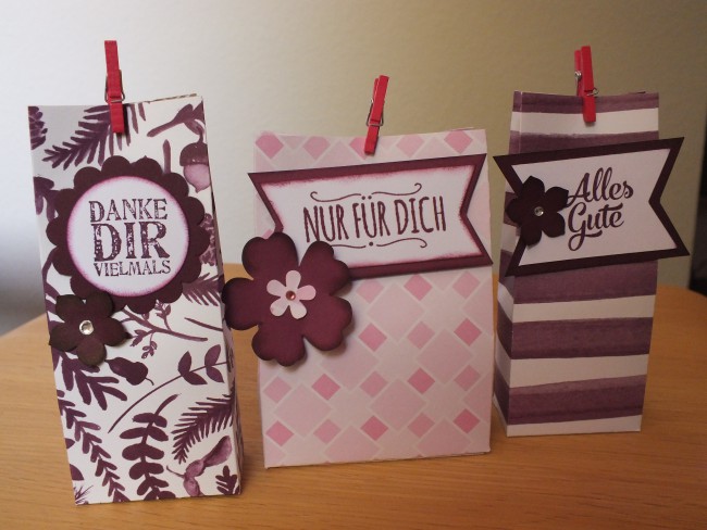 Dann werden noch zwei Etiketten für die Laschen angefertigt. Alles mit Flüssigkleber(110755) zusammenkleben. Schönes Schleifenband in „Brombeermousse“(„Himbeerrot“134564) durchziehen und zusammenbinden, fertig. Die verwendeten Produkte zeige ich euch im folgenden Link an.