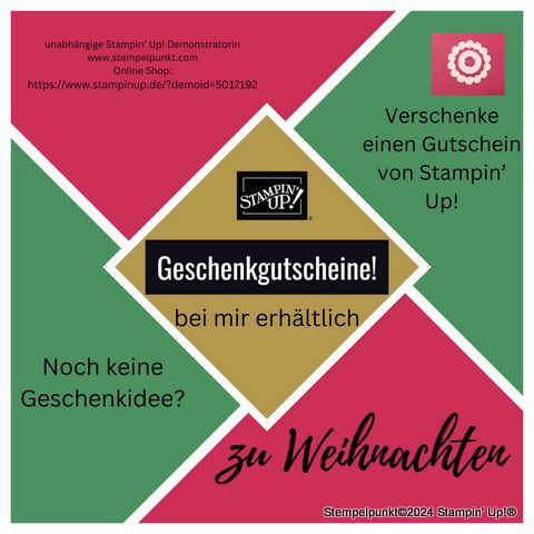 Haben deine Lieben noch keine Idee, was sie dir zu Weihnachten schenken sollen? Dann wäre ein Gutschein von Stampin‘ Up! doch eine tolle Idee. Idealerweise löst du ihn während der Sale-a-Bration bei mir ein. Und du erhältst noch weitere Geschenke (Gratisartikel).