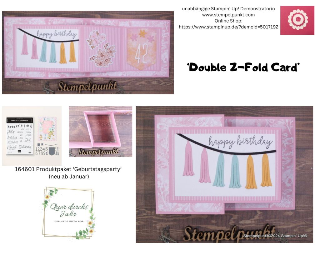 Das Thema des Instahop Quer durchs Jahr ist heute ‚DOUBLE Z-FOLD Card‘. Ich habe mit dem brandneuen Produktpaket ‚Geburtstagsparty‘ (164601) gearbeitet (erhältlich ab Januar 2025). Eigentlich wollte ich die Zahlen-Stanzformen aus dem Set verwenden. Leider ist die ‚4‘ runtergefallen und nicht mehr auffindbar. Die Zahlen sind schmal und wunderschön geschwungen.