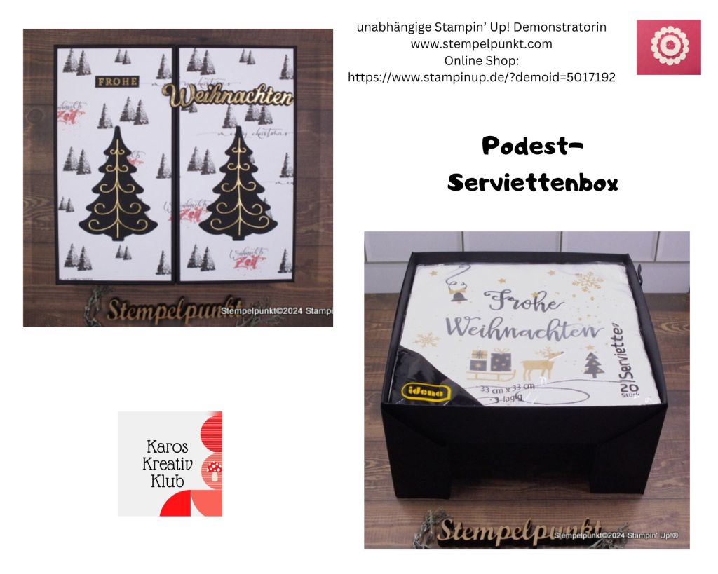 Am letzten Mittwoch gab es wieder ein gemeinsames Basteln in Karoskreativklub (KKK). Wir haben diese tolle ‚PODEST-SERVIETTENBOX‘ gewerkelt. Ich habe einen Schwarz-Weiß-Look passend zu den Servietten gewählt. Verwendet habe ich u.a. die Stanzformen ‚Dekorative Weihnachtsbäume‘ (164084) und ‚wunderschöne Weihnachtszeit‘ (164152) von Stampin‘ Up! Die Serviettenbox kann aufgestellt werden und somit für eine stilvolle Tischdekoration verwendet werden. Ein tolles Projekt.