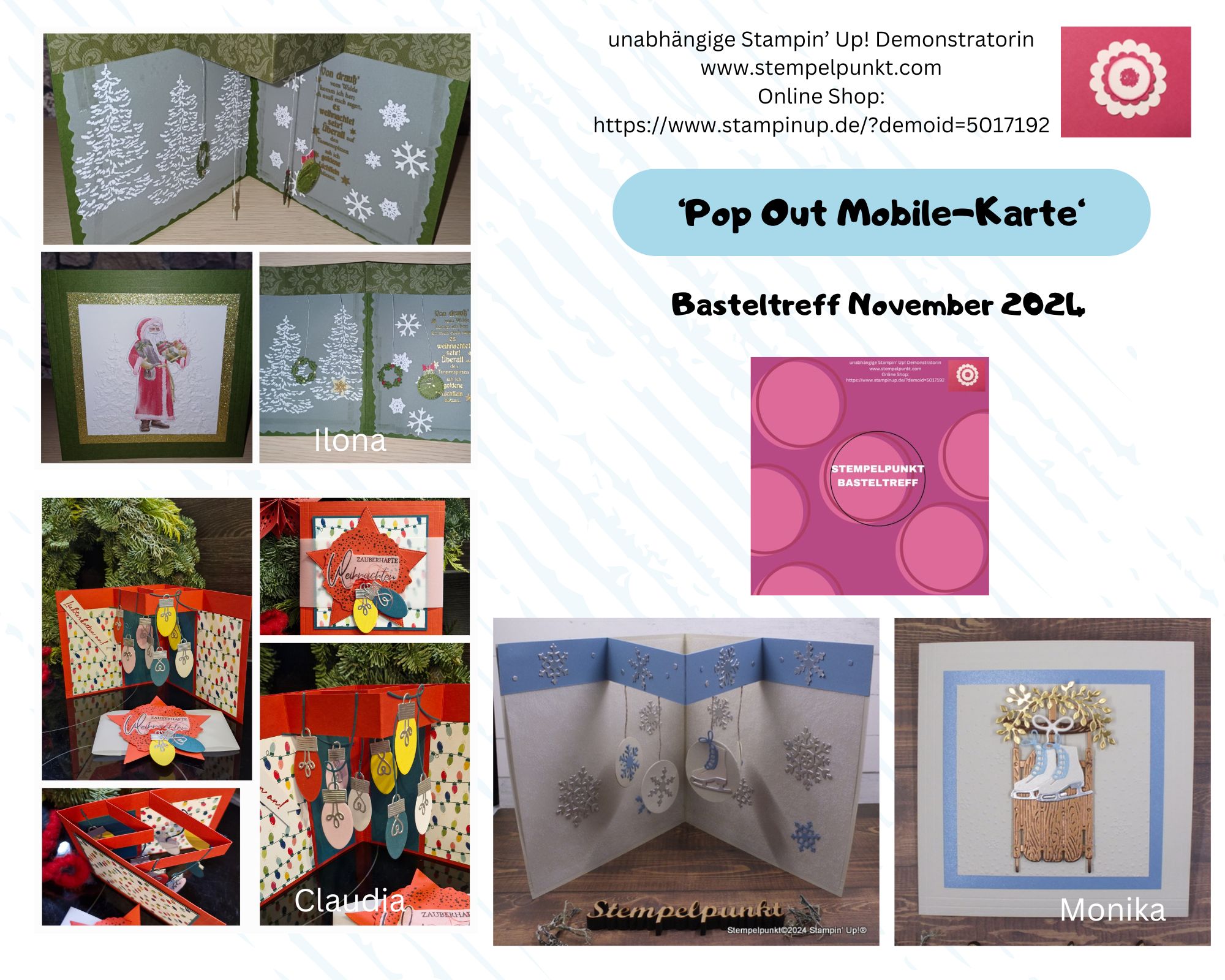 Im November gab es wieder einen ‚Basteltreff‘ per Zoom. Es ist immer eine nette Runde zum Basteln und Quatschen. Diesmal haben wir diese originelle ‚Pop Out Mobile-Karte‚ gewerkelt. Wenn du auch teilnehmen möchtest, melde dich bei mir. Die Termine stehen rechts auf meinem Blog. Der nächste Termin ist am 7. Januar, ab 19.00 Uhr. Den Zugangslink gibt es immer nach der Anmeldung.
