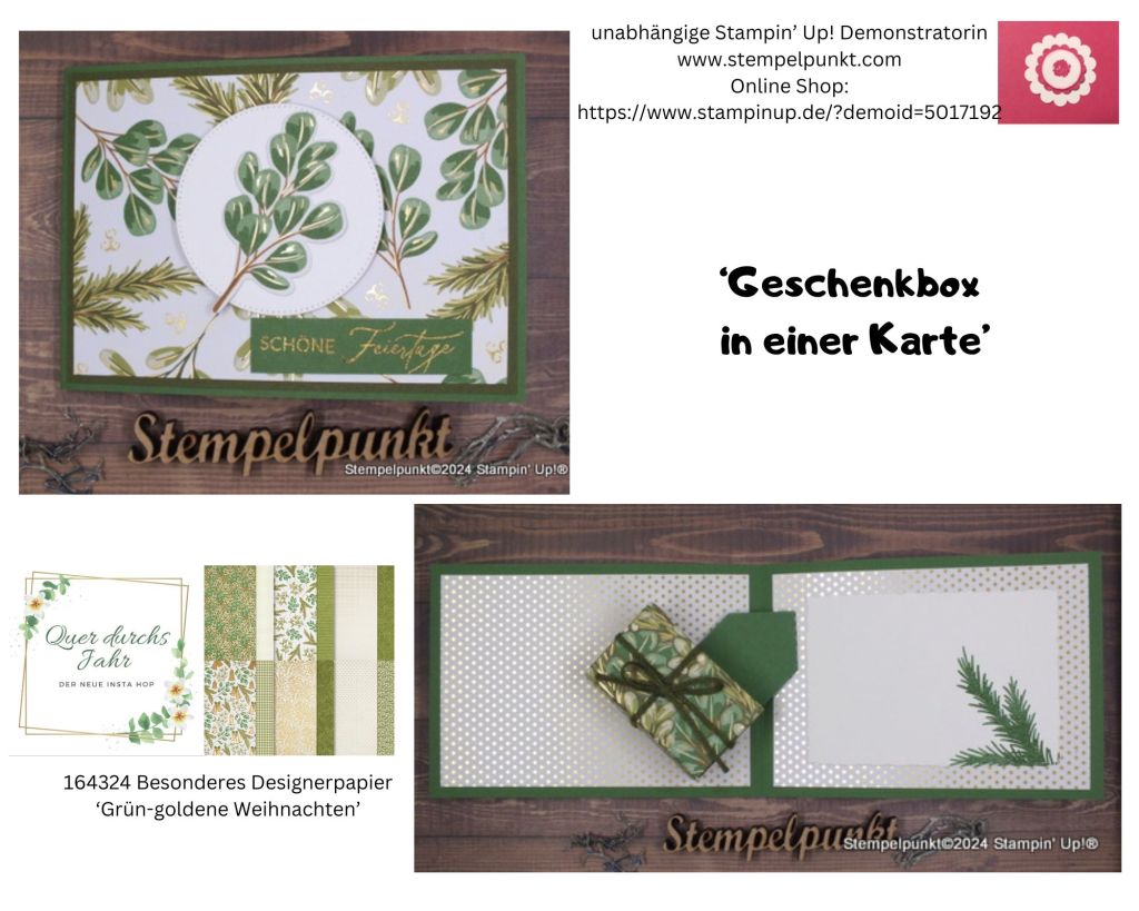 Heute haben wir das Thema ‚GESCHENKBOX IN EINER KARTE‘. Meine Schachtel lässt sich nicht wirklich als Box verwenden, weil alles zusammengeklappt wird. Aber ein Gutschein passt hinein. Ich finde die Kartenform genial. Ich habe mit dem tollen Designerpapier ‚Grün-goldene Weihnachten‘ von Stampin‘ Up! gearbeitet.