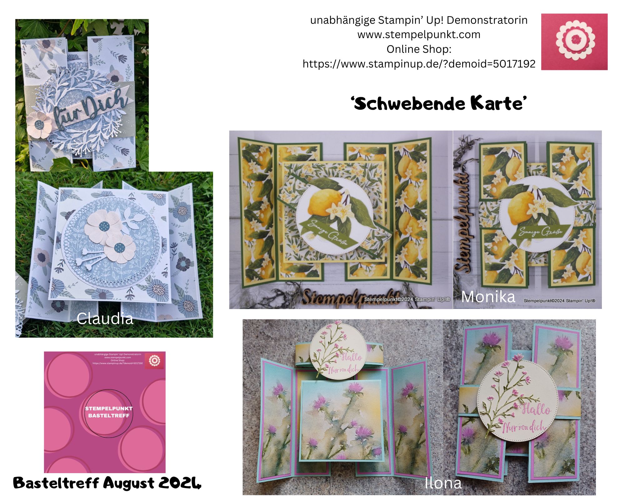 Ich möchte euch nicht die Ergebnisse von meinem BASTELTREFF per Zoom im August vorenthalten (sofern ich Fotos davon bekommen habe). Wir haben zusammen diese ‚SCHWEBENDE KARTE‚ gebastelt. Wenn du auch teilnehmen möchtest, melde dich bei mir. Die Termine stehen rechts auf meinem Blog. Der nächste Termin ist am 29. Oktober, ab 19.00 Uhr. Den Zugangslink gibt es nach der Anmeldung.