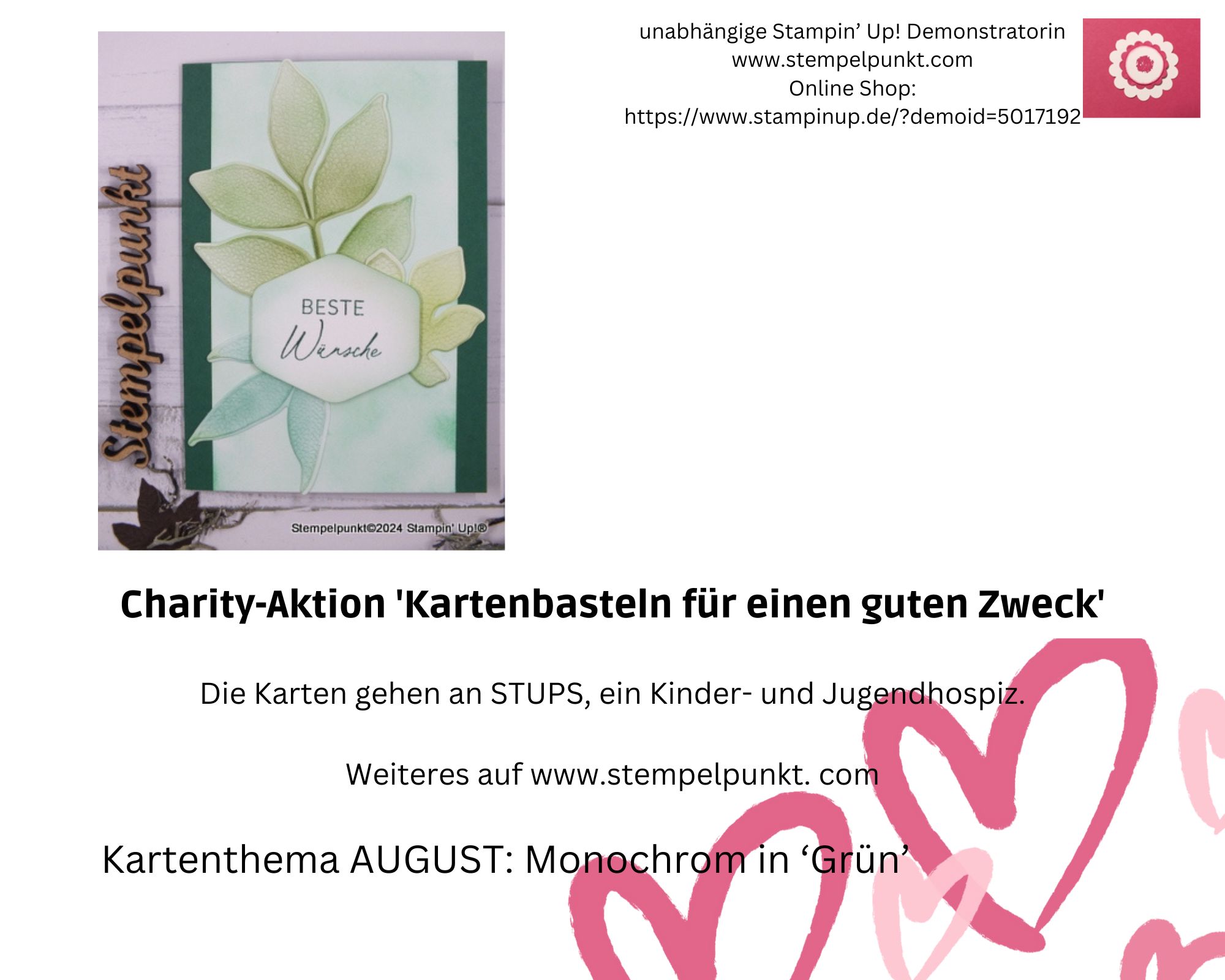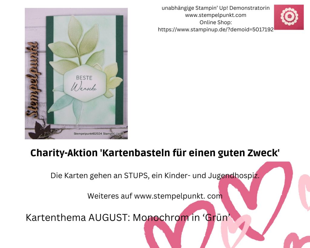 Im Video zur Charity-Aktion zeige ich eure gespendeten Karten vom Juli. Und es gibt eine neue Vorgabe für den August – ‚MONOCHROM IN GRÜN‘. Ich freue mich auf eure Karten. Anfang September gibt es ein neues Video dazu.