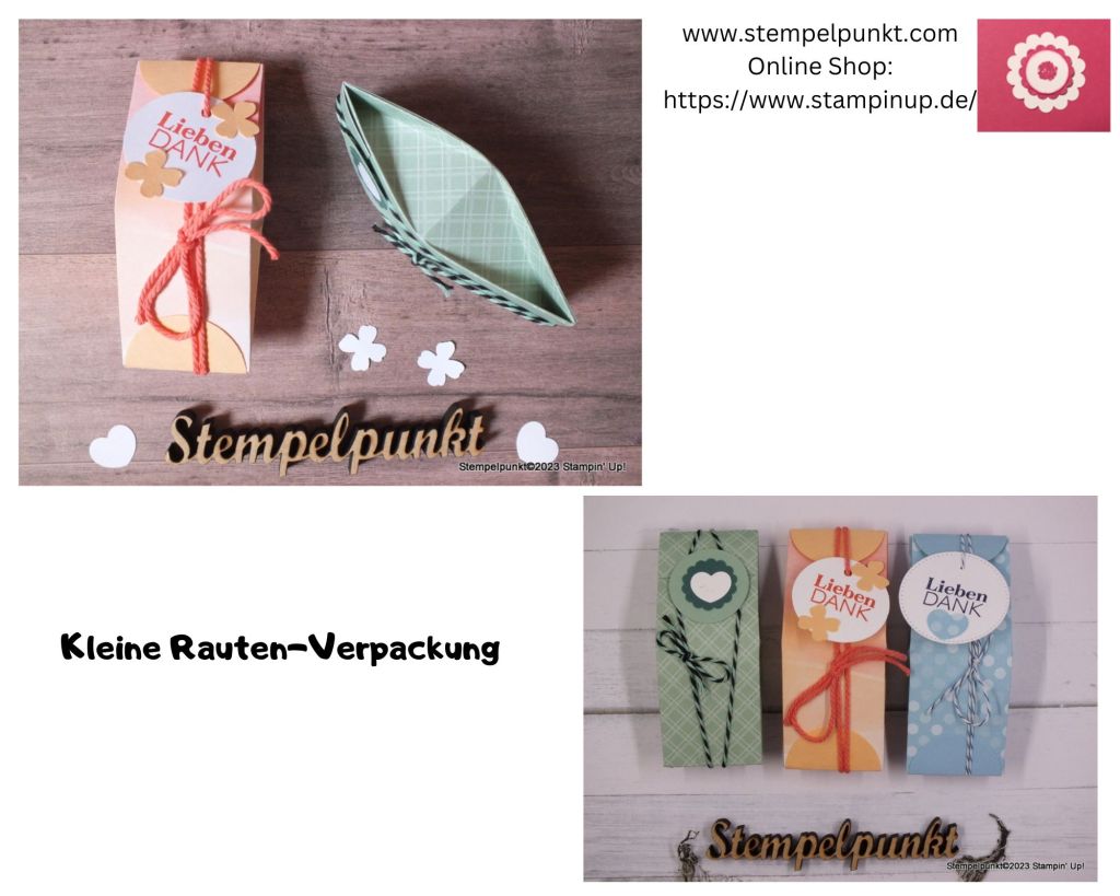 Heute zeige ich euch diese süße Rauten-Verpackung** – ein schnelles Goodie. Ihr könnt beliebiges Designerpapier verwenden. Wisst ihr schon, dass es im Juni die ‚Designerpapier-Aktion‚ gibt: es gibt einen Preisnachlass von 15%!