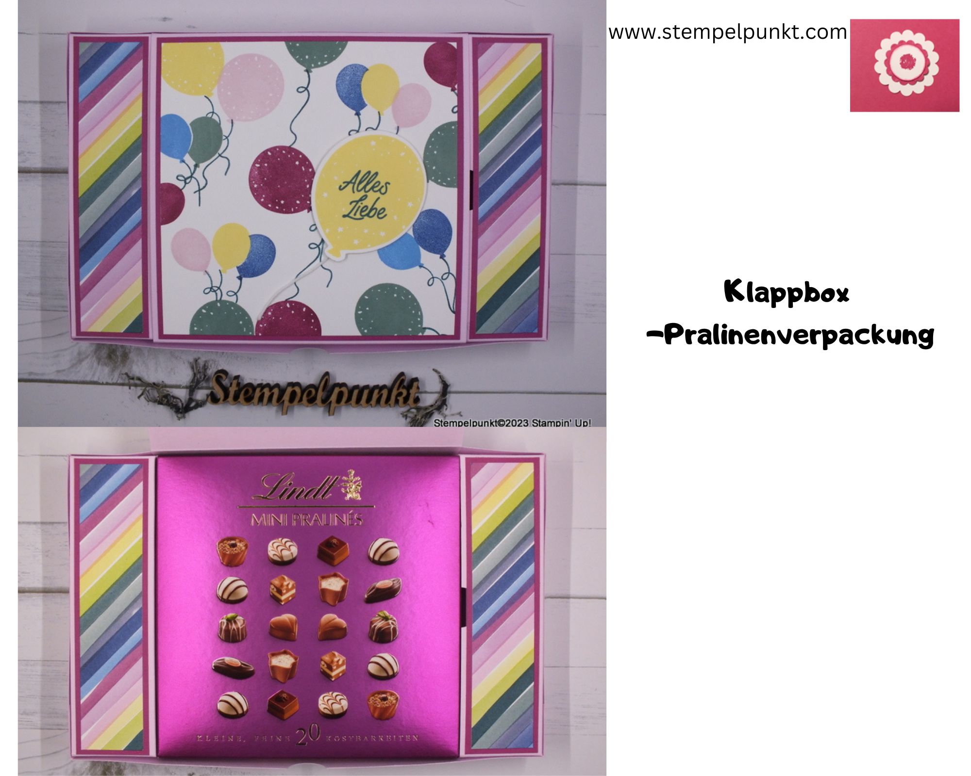 Heute zeige ich eine Klappbox-Pralinenverpackung. Die Idee kommt von Stempelmitmir. Carmen bietet auf Instagram Mitmach-Bastelabende an. Die Verpackung macht richtig etwas her. Ich habe mit neuen Farben und dem Designerpapier ‚Bezaubernd bunt‘ von Stampin‘ Up! gearbeitet. Das Designerpapier auf dem Klappdeckel habe ich gestempelt.