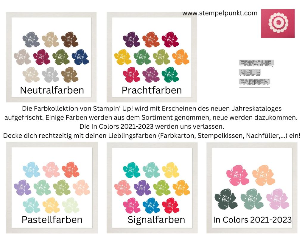 Ab Ende März wird es die ersten Informationen geben, welche Farben rausgenommen werden und welche dazukommen. Erfahrungsgemäß sind einige Produkte dann sehr schnell ausverkauft. Deshalb solltest duFarbkarton, Stempelkissen, Nachfüller in deinen Lieblingsfarben möglichst bald nachbestellen. Am 27. März biete ich eine Sammelbestellung an. Melde dich gerne bei mir.