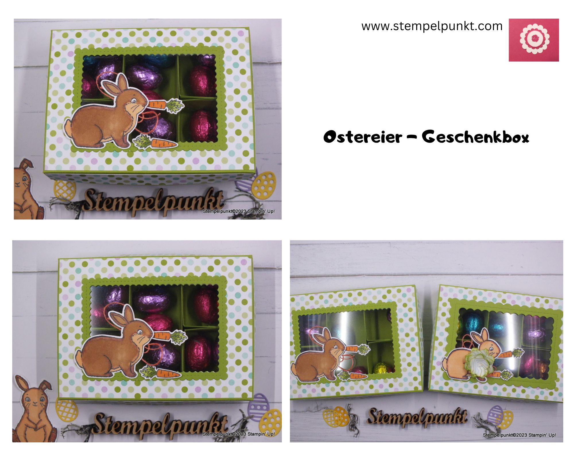 Heute zeige ich eine OSTEREIER-GESCHENKBOX** mit Unterteilungen. Es kam das süße Häschen aus dem Stempelset ‚Osterhase‘ zum Einsatz. Und wer genau hinschaut, findet die 3-D-Blume aus einem vorherigen Video von mir wieder.