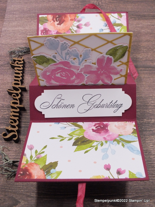 Diese QUADRATISCHE POP UP KARTE habe ich nach der Anleitung von Karos Kreativklub gearbeitet. Das Pop Up- Element in der Mitte könnte auch eine Gutscheinkarte sein oder ein gestempeltes Kärtchen. Es kam die Produktreihe ‚Voller Anmut‘ zum Einsatz.