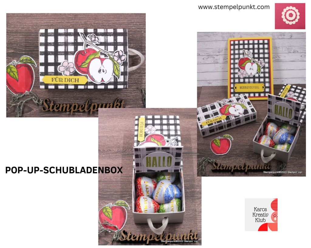Beim letzten Bastelabend von #karoskreativklub haben wir diese pfiffige Box mit einem Aufziehmechanismus gebastelt. Für die Ausgestaltung habe ich das Stempelset ‚Apfelernte‘, die passenden Stanzformen ‚Apfelblüten‘ (nur im September erhältlich) und das wunderschöne Designerpapier ‚Landhauskaros‘ von Stampin‘ Up! verwendet.