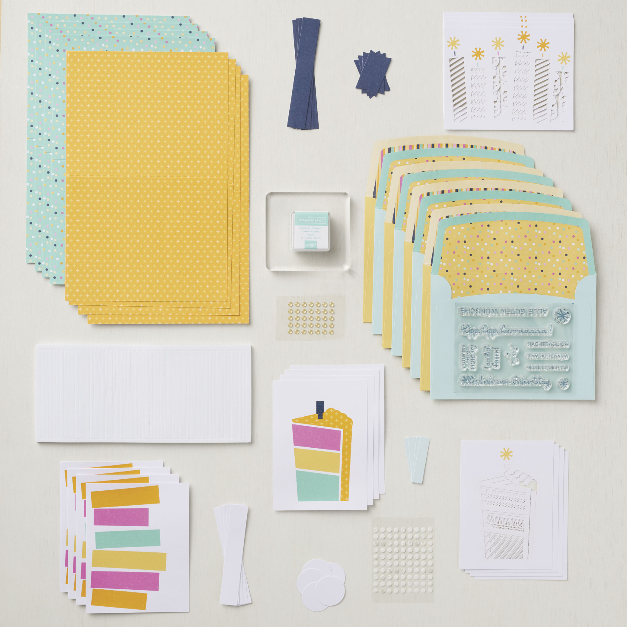 bedruckte Grundkarten, vorgeschnittene, bedruckte Elemente, Klebemittel, Accessoires und ein transparenter Block.
