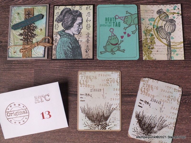 In unserer Demo- Gruppe (Stempelzeitteam) gibt es immer wieder Aktionen. In diesem Jahr habe ich zum ersten Mal an einem ATC-Adventskalender teilgenommen. ATC= Artist Trading Card. Es waren die Farben ‚Lindgrün‘,’Jade‘ und ‚Granit‘ sowie 2 beliebige weitere Farben vorgegeben. Und es sind total schöne Kärtchen entstanden. Es macht richtig Spaß. Ich zeige an dieser Stelle nur eine kleine Auswahl.