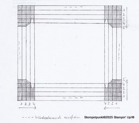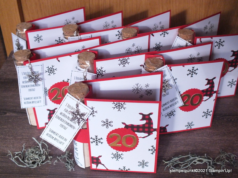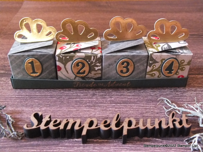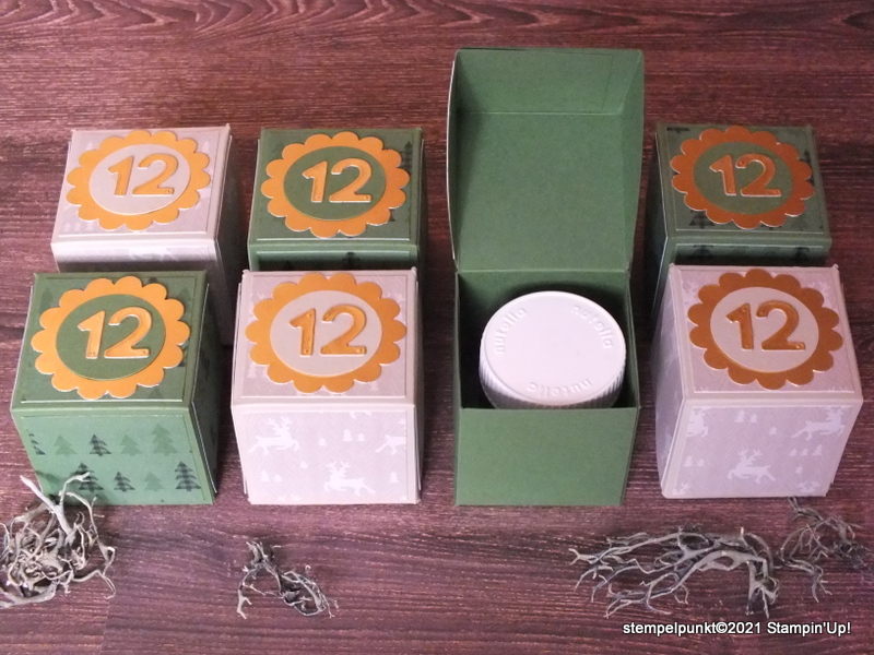 Gearbeitet habe ich mit den Stanzformen ‚Geschenkschachtel nach Wunsch‘ aus dem Minikatalog Herbst/Winter. Die Stanzform ist genial. Damit lassen sich niedliche Verpackungen für den Kaffeetisch oder auch ganze Adventskalender im Nu herstellen.